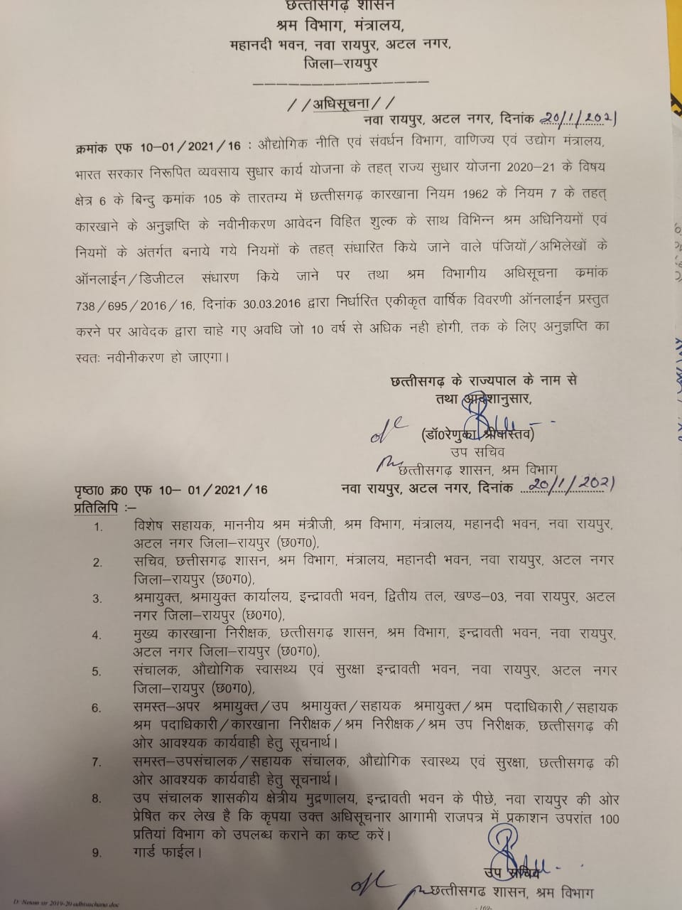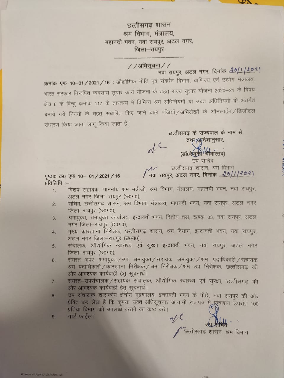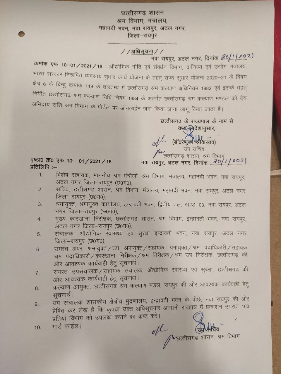 अधिसुचना - क्रमांक एफ 10-01 /2021/16 , छ. ग. श्रम कल्याण मण्डल को देय अभिदाय राशि श्रम विभाग के पोर्टल पर ऑनलाइन जमा किया जाना लागू किया जाता है ।